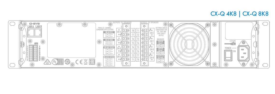 • 高達(dá)8000W總輸出功率,全部通道均支持定阻,或70V,100V定壓輸出。