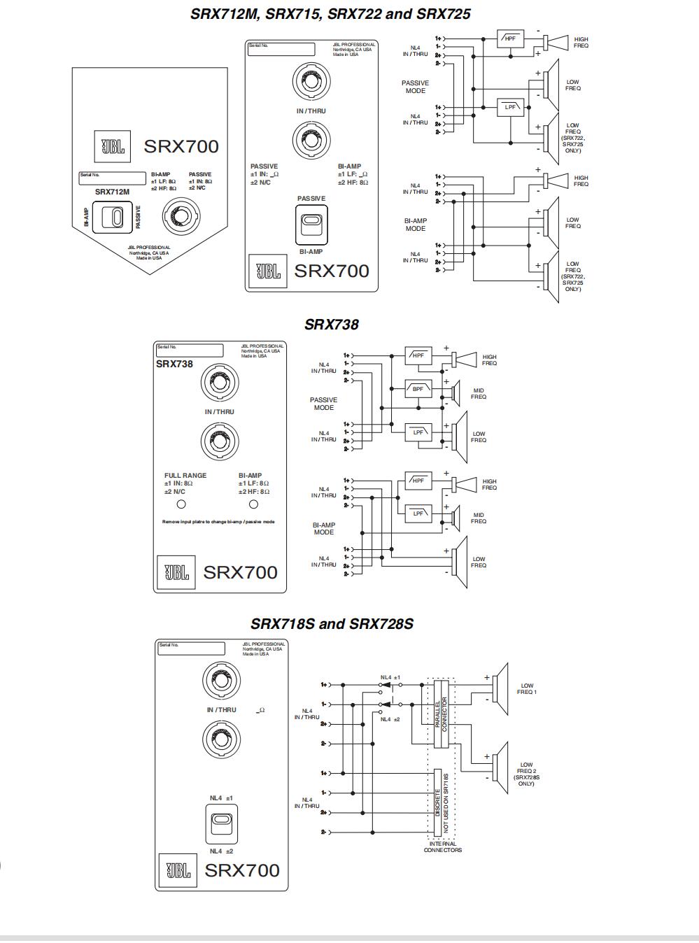 所有SRX700二路或三路揚聲器都可用單功放或雙功放驅(qū)動。驅(qū)動模式可用現(xiàn)在流行的、安裝在音箱輸入面板上的撥動開關(guān)進行轉(zhuǎn)換。超低音揚聲器中的開關(guān)采用相同的安排:選擇±1或±2。