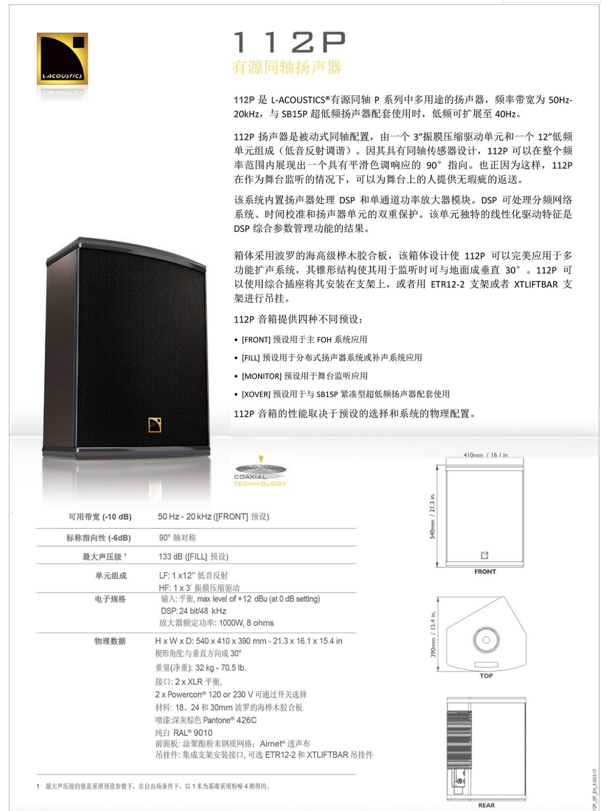 為適合現(xiàn)場(chǎng)監(jiān)聽(tīng),108P與大型系統(tǒng)有相似的聲效。112P 能用作各種舞臺(tái)的監(jiān)聽(tīng),也適合做小場(chǎng)地的主擴(kuò)和補(bǔ) 聲。它們都可以與SB15P低音搭配,讓低頻下限更低。